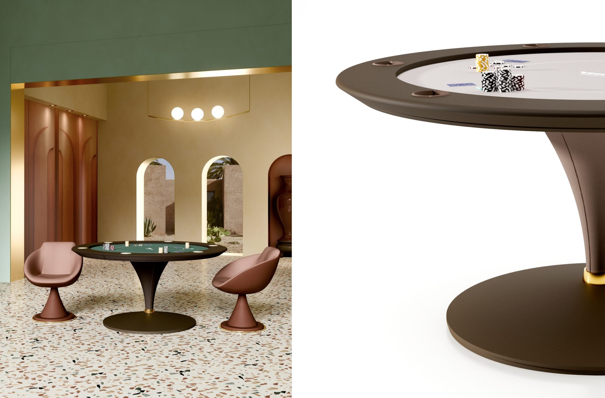 Asso is a round poker table for 6 players. In addition of being a perfect game table, it is an aesthetic element that furnishes and enriches modern environments, such as private game rooms, VIP clubs and luxury yachts.