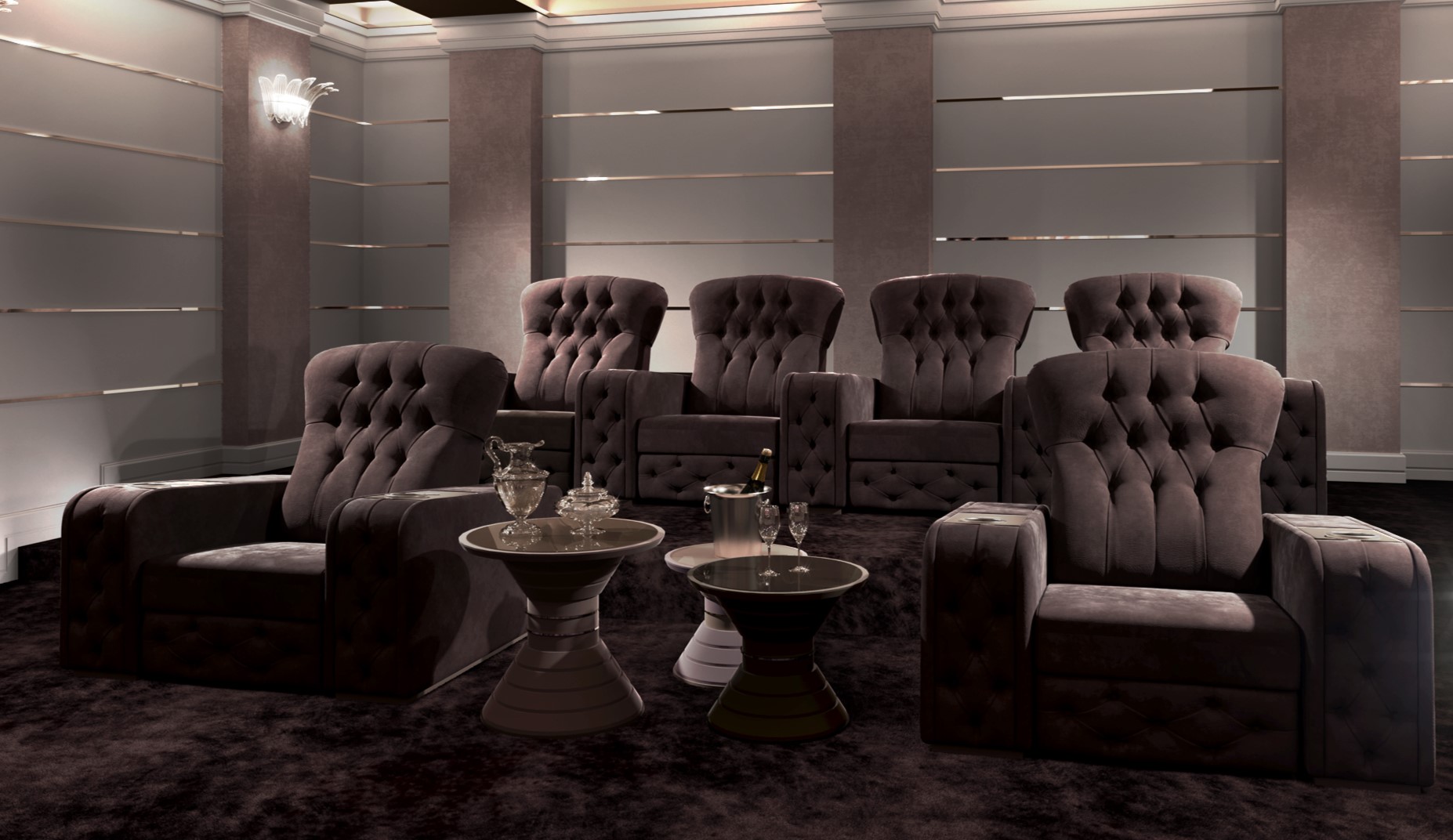 Chest cinema chair draws inspiration from the 19th century Chesterfield with its distinctive handmade capitonné.