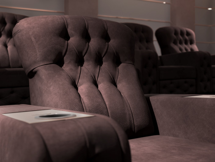 Chest reclining chair can be enriched with optional cooling cup holder, USB chargers, swivel touch lamp and an exclusive lift bar unit that rises up from the central arm. To create a completely customized space, the client can compose its own layout at will, choosing between curved or straight row, and including single seating, love-seats and daybeds. Chest Theater Seating is covered with precious leather, fabrics and bespoke cloth according to customer needs.