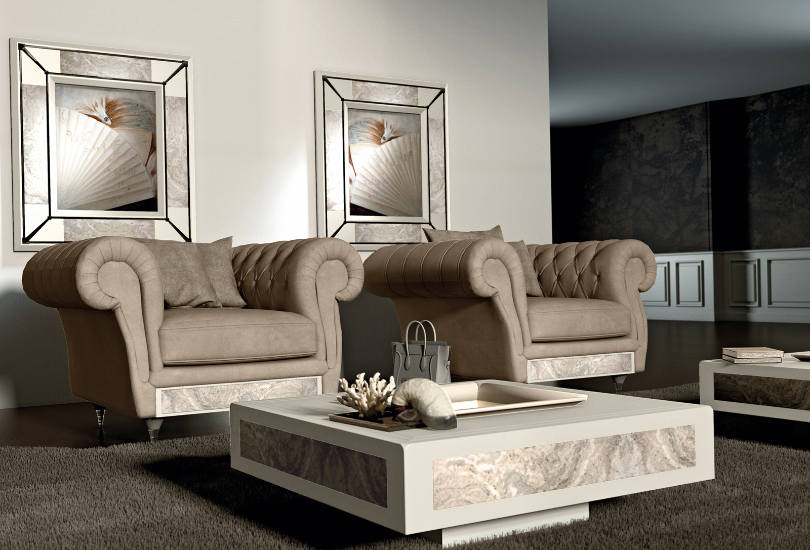 In Vismara Coffee Tables beauty and functionality live perfectly together. Ciaika coffee table is the most classical one with a strong and unmistakable design. Ciaika can be enriched with baroque, art deco, classic and many other decorations. What makes Ciaika a unique product is its container function which permits to store books, dvds and other objects. Furthermore, a special space in the middle has been created to keep liquors bottles. Windows model is the most contemporary coffee table; its linear shape and its smart design give a touch of elegance to every space of the home. The main features are the distinctive glass windows, that work as showcases for displaying precious objects and as functional trays. Under the on sight compartment, there is a secretaire in which can be placed everything that have to be concealed. Instead of the glass window, can be integrated a bio-ethanol brazier that creates a classy and intimate atmosphere. This coffee table is valued with precious decorative inserts like inlaid woods, embroidered leathers, marbles and more over.