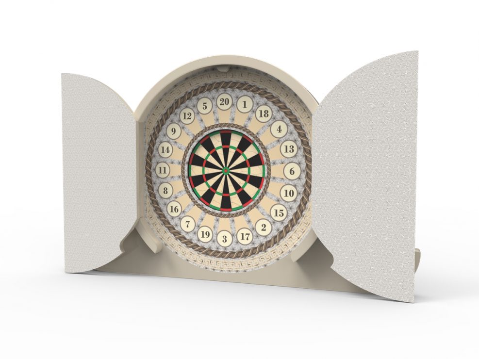 Argo, luxury dartboard cabinet, is a real piece of art. Two decorative doors adorned with Circus Edition surrealistic illustrations, conceal the real heart of the product: the dartboard. The target is made of African Sisal, a natural fiber which doesn’t leave darts holes. A decorative patterned foam, placed around the dartboard and on the inner side of doors, protects the cabinet from unlucky shots.